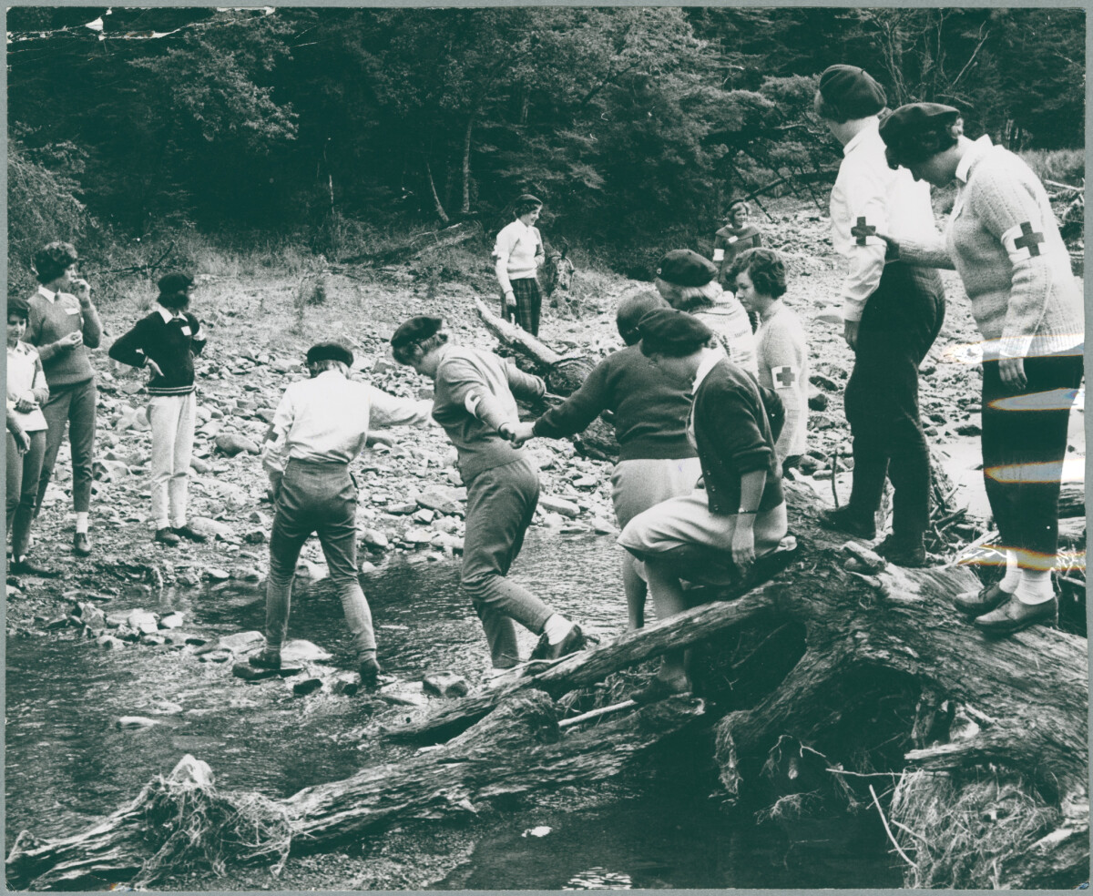 Red Cross Society No 3 Field Ambulance members showing female cadets the correct techniques for water crossings.