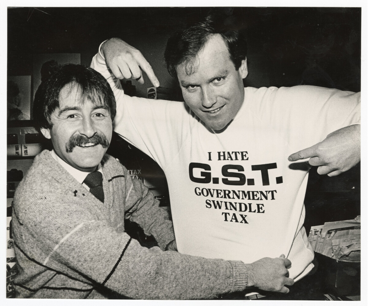 Mr Alistair Kinniburgh (right) and Mr Euan Cameron, owners of a photography shop in the Triangle Centre on the corner of Cashel Street and Colombo Street, with a t-shirt protesting goods and services tax.