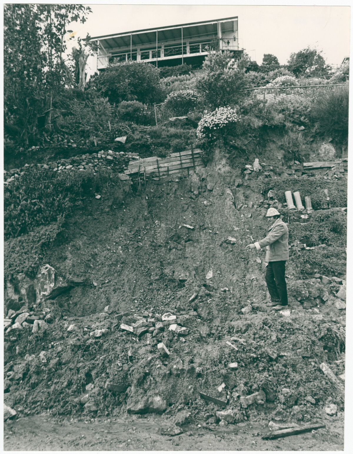 View of a collapsed bank beneath the holiday home of surgeon, Pat Bay.