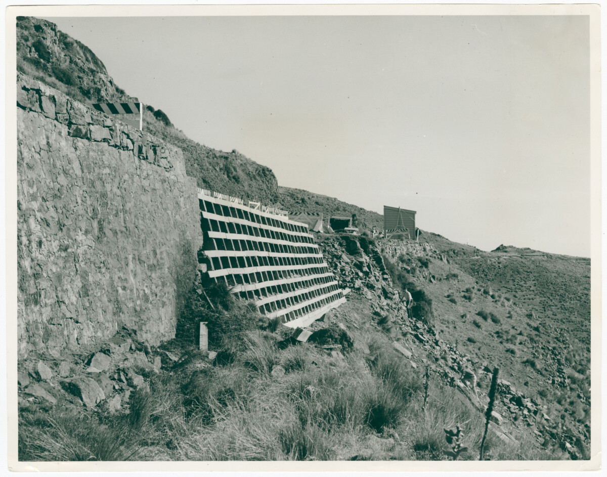 View along Summit Road near the Bridle Path of a road slip where concrete slabs are being put into position to repair the damage.