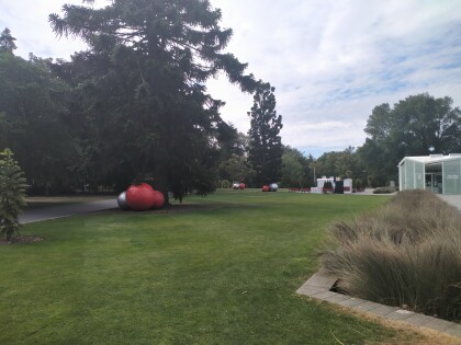 Large Christmas baubles under trees at the Botanic Gardens near ...