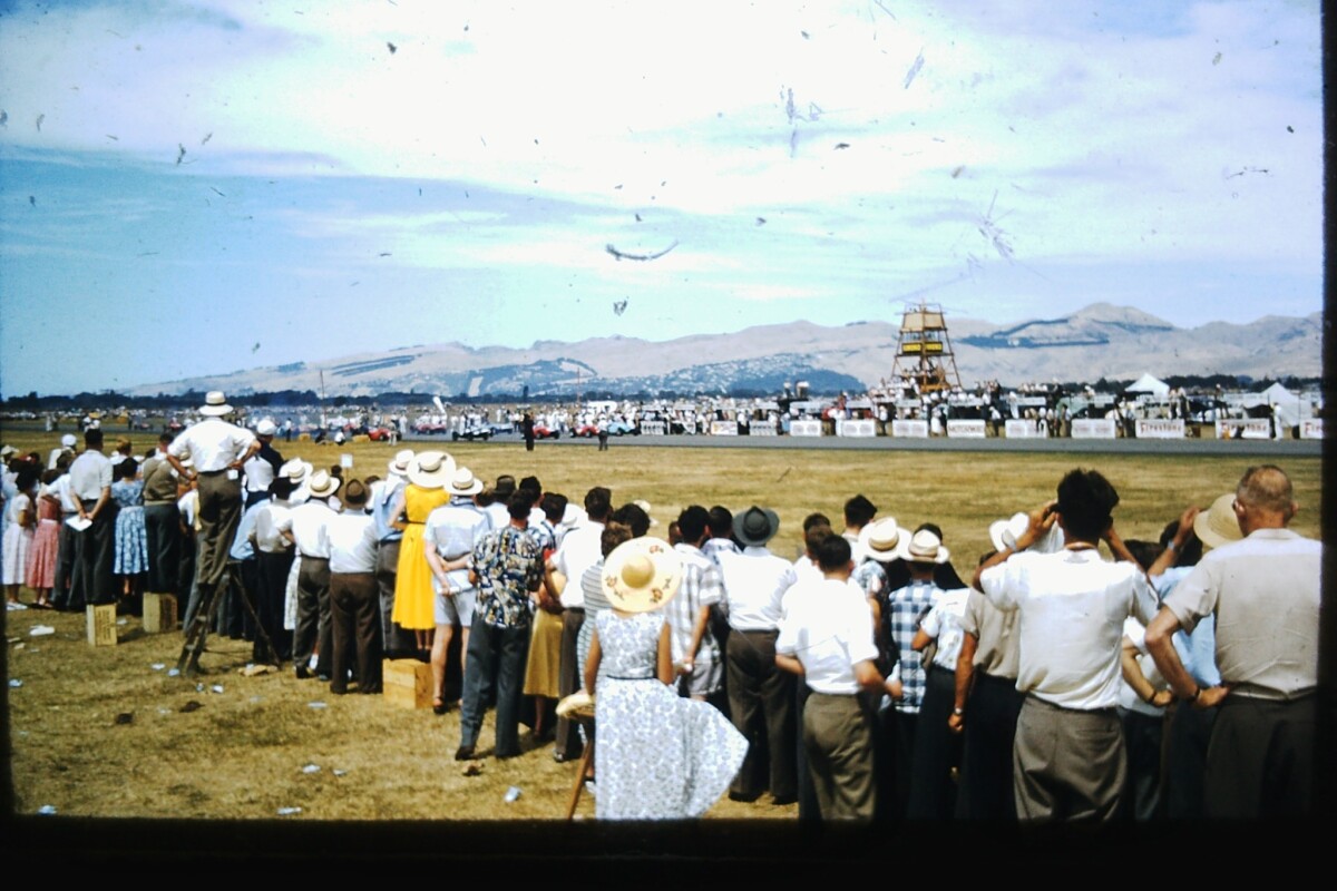 Crowds of people at Wigram Airfield watching the start of the Lady Wigram race. The race cars are visible on the runway with views across to the Port Hills in the background.