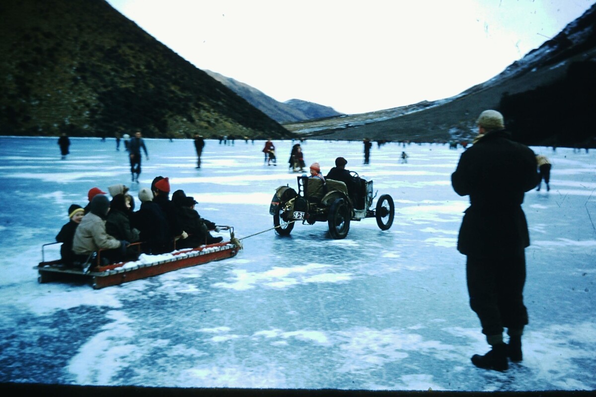 A vintage car taking a sled of children for a joy-ride across the frozen Lake Ida. Groups of people are ice skating in the background.