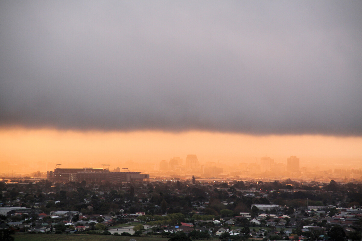 "Jade Stadium, as it was named then, under the shroud of low heavy clouds on a September evening in 2010 - just as the sun was setting between the low cloud and the Southern Alps. Taken from St Andrews Hill" - Contributor's note