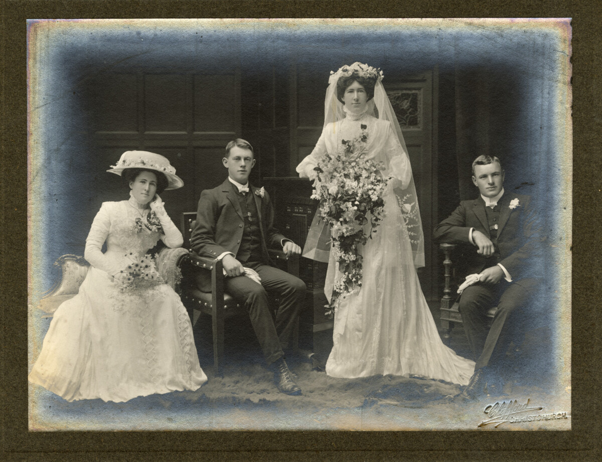"My grandparents wedding in 1910. The bride was Agnes Sarah Muir and the groom was Percy Vernon Bailey. The best man was Frank Kemp and the bridesmaid was Lilly Muir. The wedding was at St Peter's Church in Riccarton. They had five children, Orton, Elaine (my mother), Keith, Colin and Ian, who grew up at Springstonon a farm called 'Cressbrook'" - Contributor's note