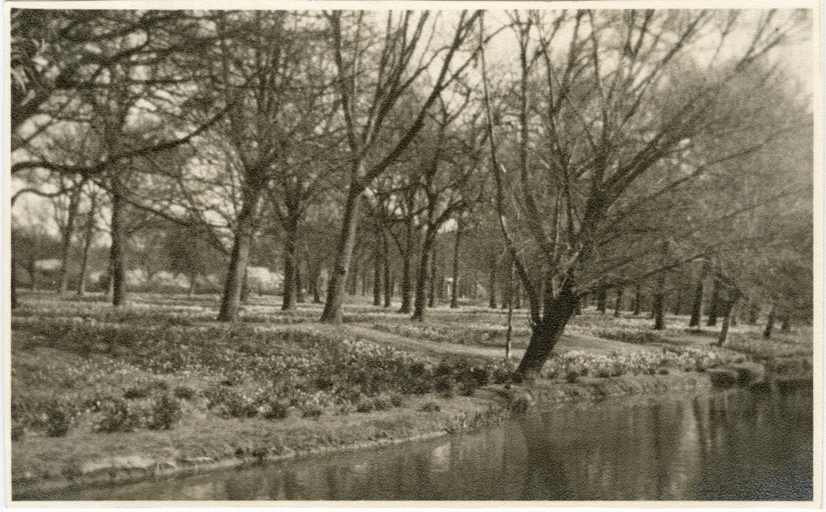 View of daffodils blooming along the banks of the Avon River in Hagley Park.