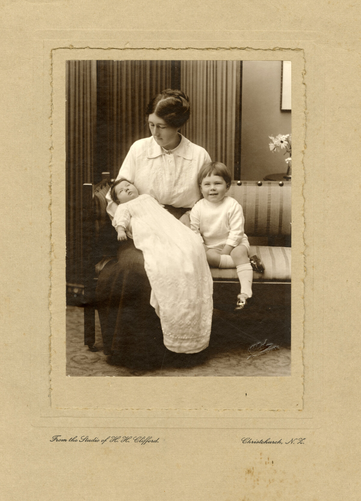 "My grandmother Agnes Bailey with baby Elaine Mary [Bailey], in her christening gown, on her knee and Orton Trevor [Bailey] sitting next to her." - Contributor's note