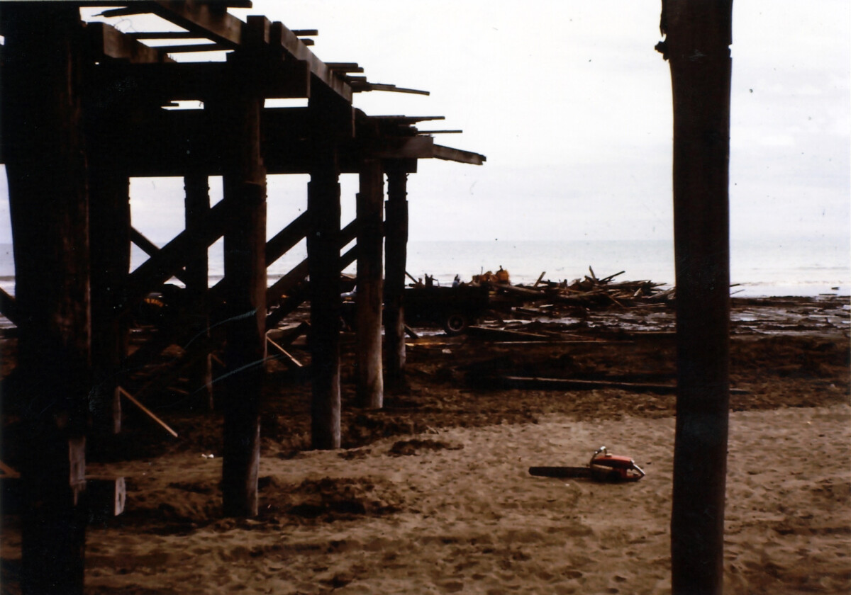View of the wooden pier at New Brighton being demolished, taken from New Brighton beach. The photograph was taken by the contributor's father, Norman Dawes, who worked for Christchurch City Council as a loader driver.