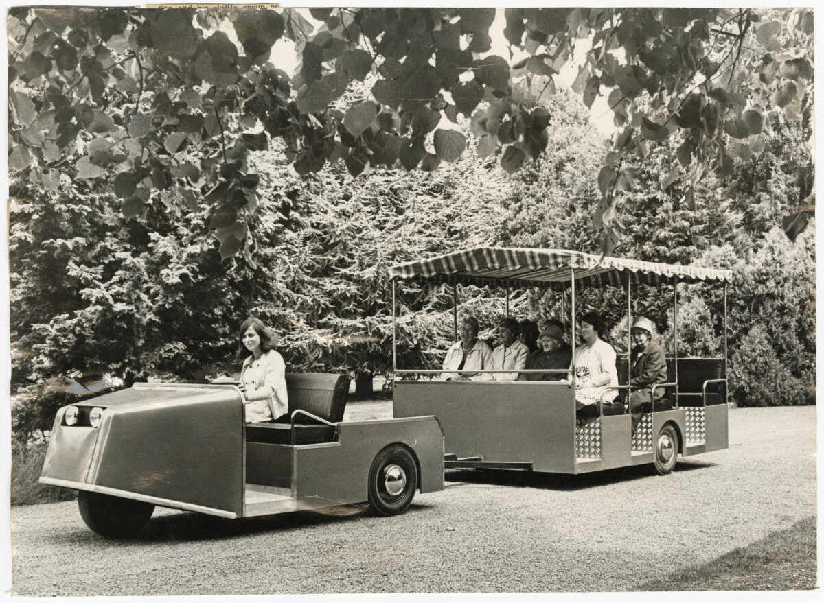 The three-wheeled, battery powered vehicle, pulling a trailer which carries twelve adults on vinyl-upholstered seats, moves almost silently, with a maximum speed little faster than a brisk walking pace.
