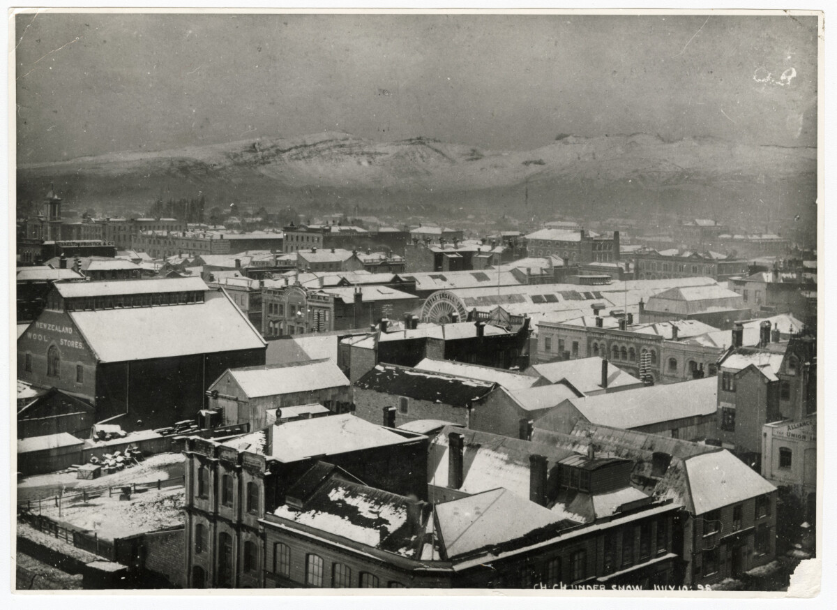 Central Christchurch rooftops and the Port Hills covered in snow during the winter of 1898. St. Pauls Presbyterian Church is at the top left with the photograph being taken from the top of ChristChurch Cathedral looking South East towards the Port Hills.