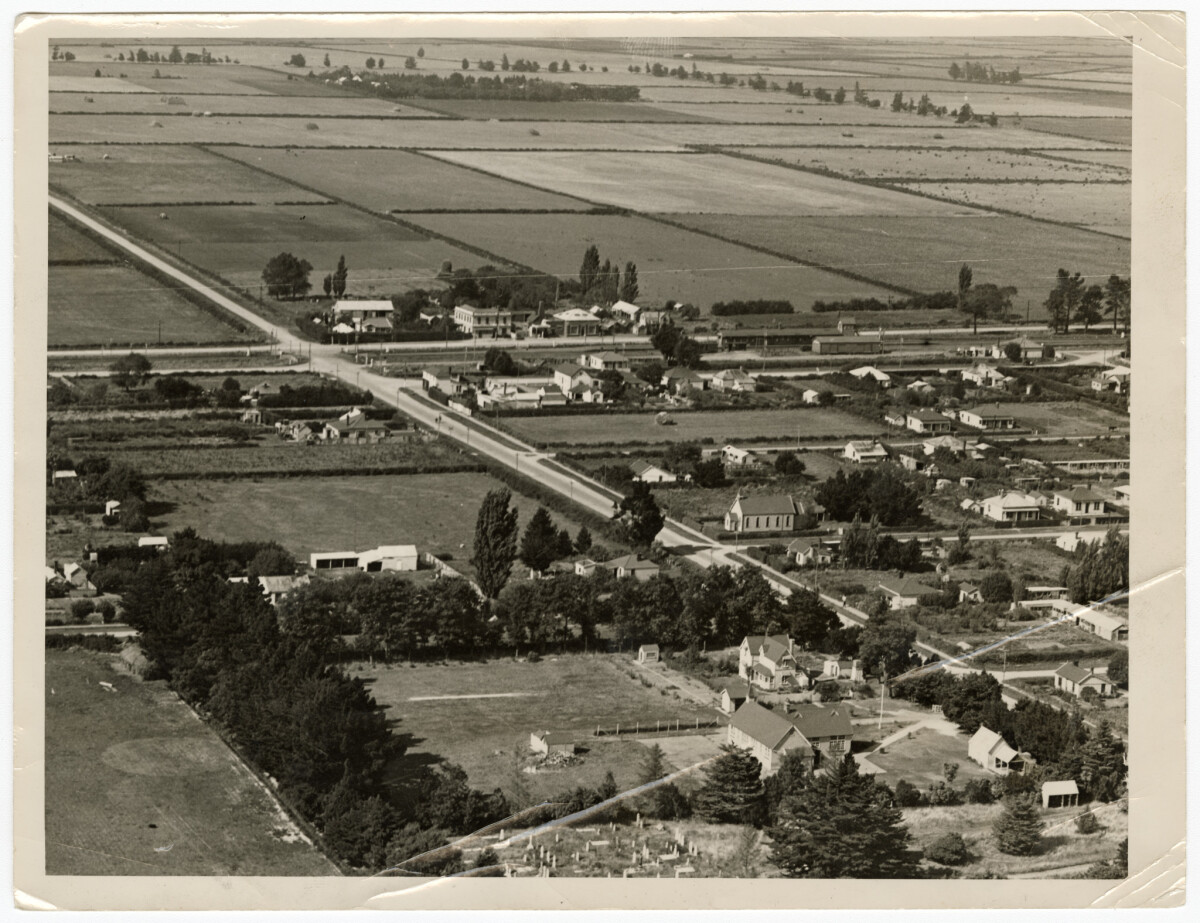 Aerial view of Templeton looking along Kirk Road towards the train station and tracks running alongside Main South Road.