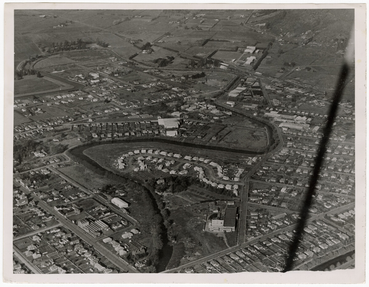 Aerial view of Woolston with the Heathcote River running through the centre. Ferry Road is to the left and Radley Street is to the right. Rutherford Street runs behind the river.