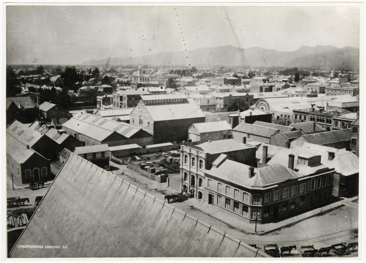 Central Christchurch looking south east. St. Pauls Presbyterian Church is in the centre rear with the south of Cathedral Square in the foreground. The photograph is being taken from the top of ChristChurch Cathedral looking towards the Port Hills.