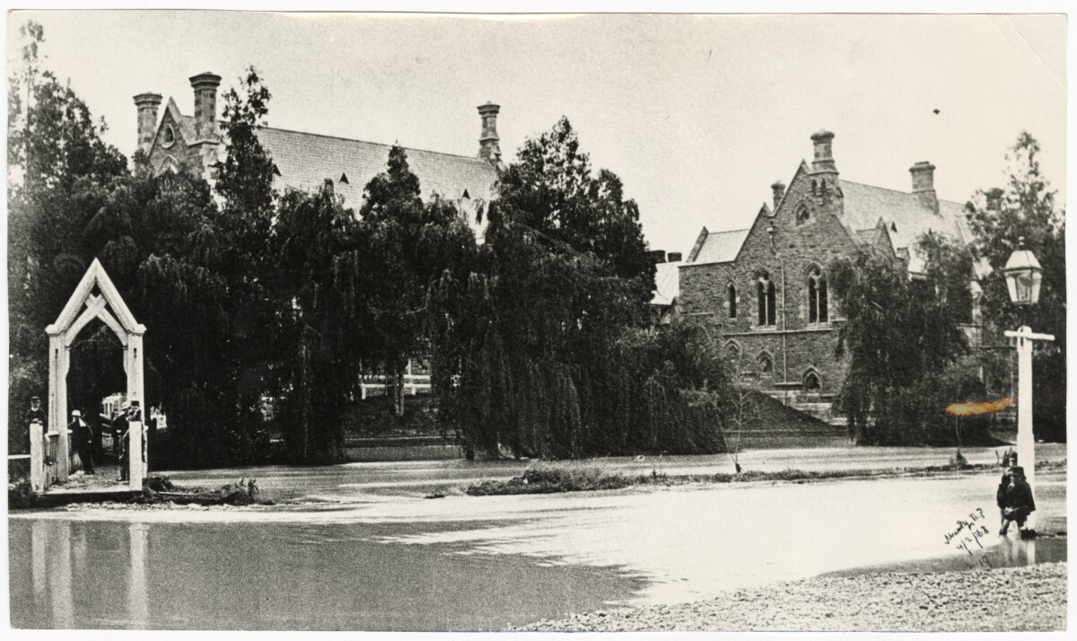 Looking across the swollen river to the Canterbury Provincial Council buildings. Seen are the Provincial Council chamber and Bellamy's.