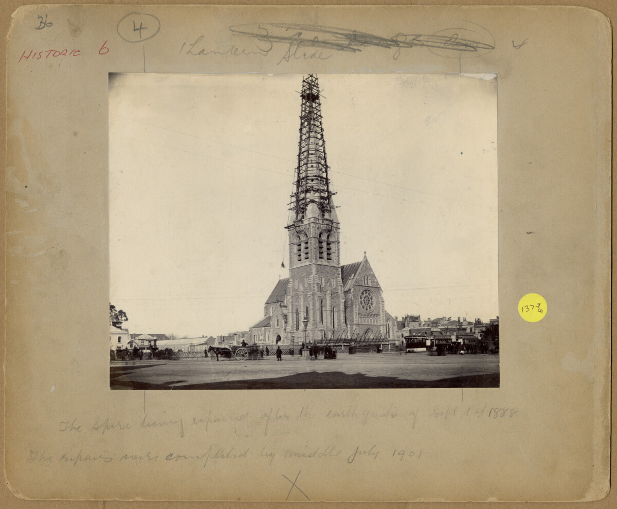 ChristChurch Cathedral spire being replaced after an earthquake in 1888.