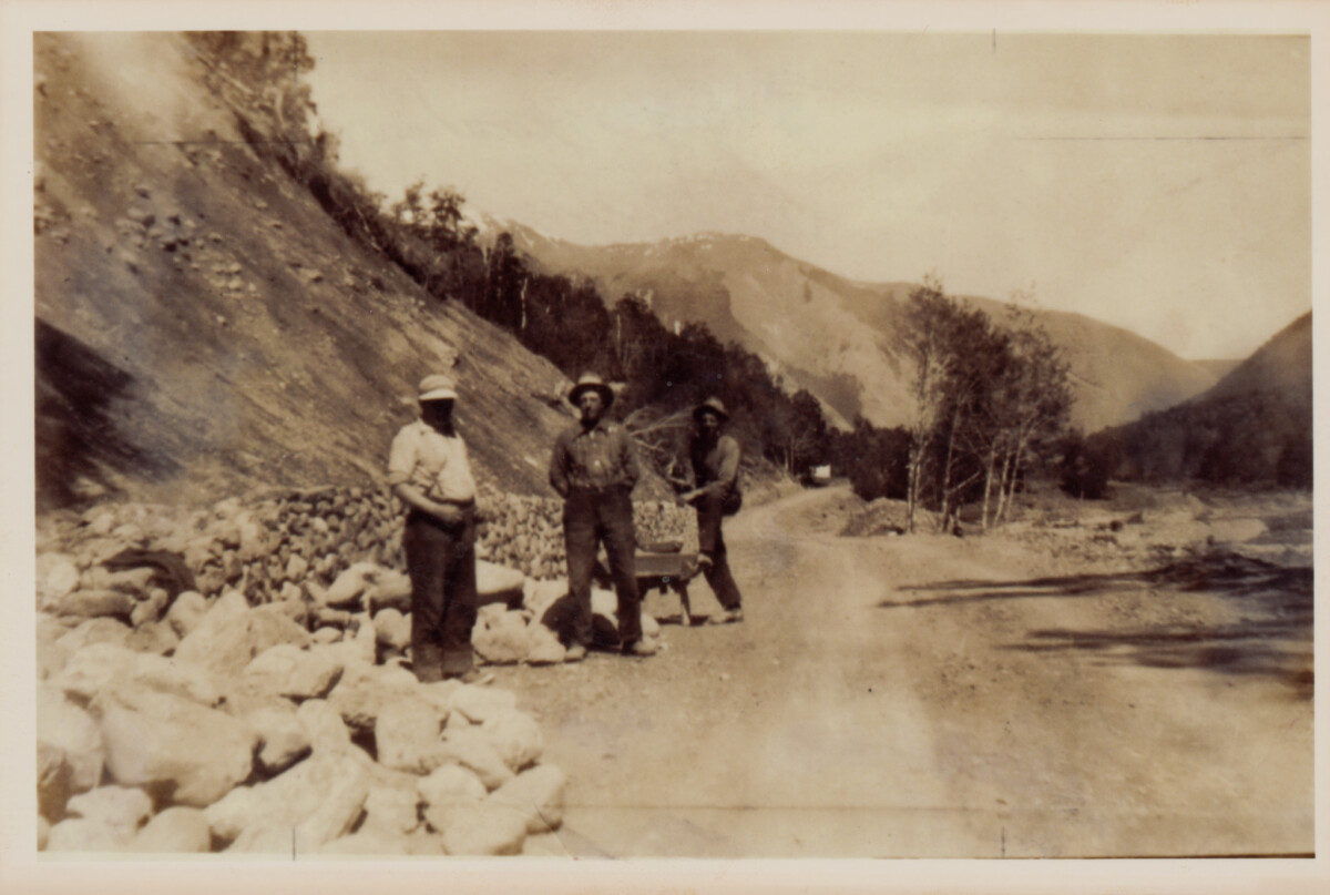 View of three men working on the construction of a stone retaining wall at Jollies Pass during the 1930's Depression. The photos are also available in The Sugar Bag years by Tony Simpson, 1974.
