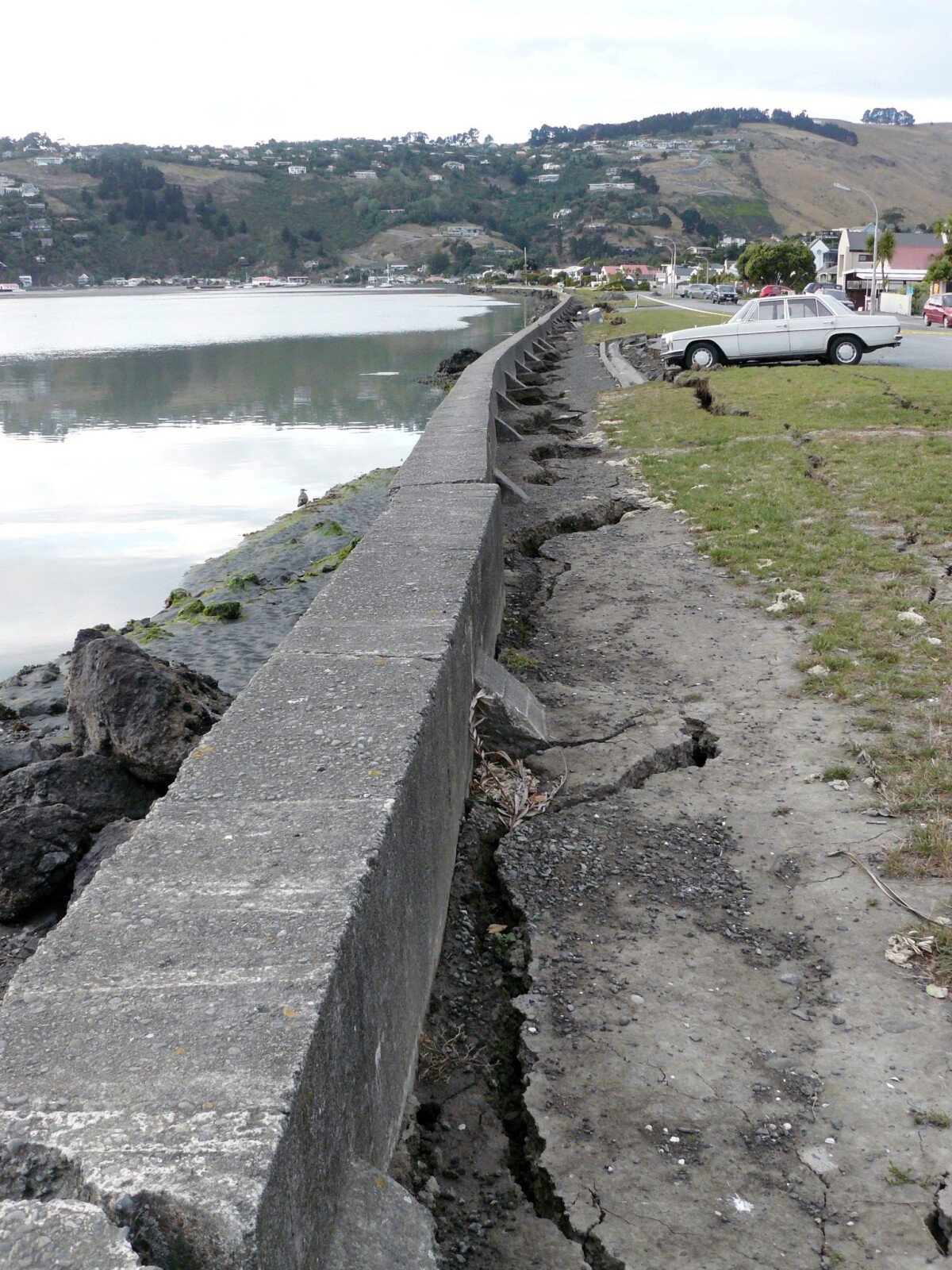 Damage to seawall at Beachville Road, Redcliffs. Moncks Bay is in the background.