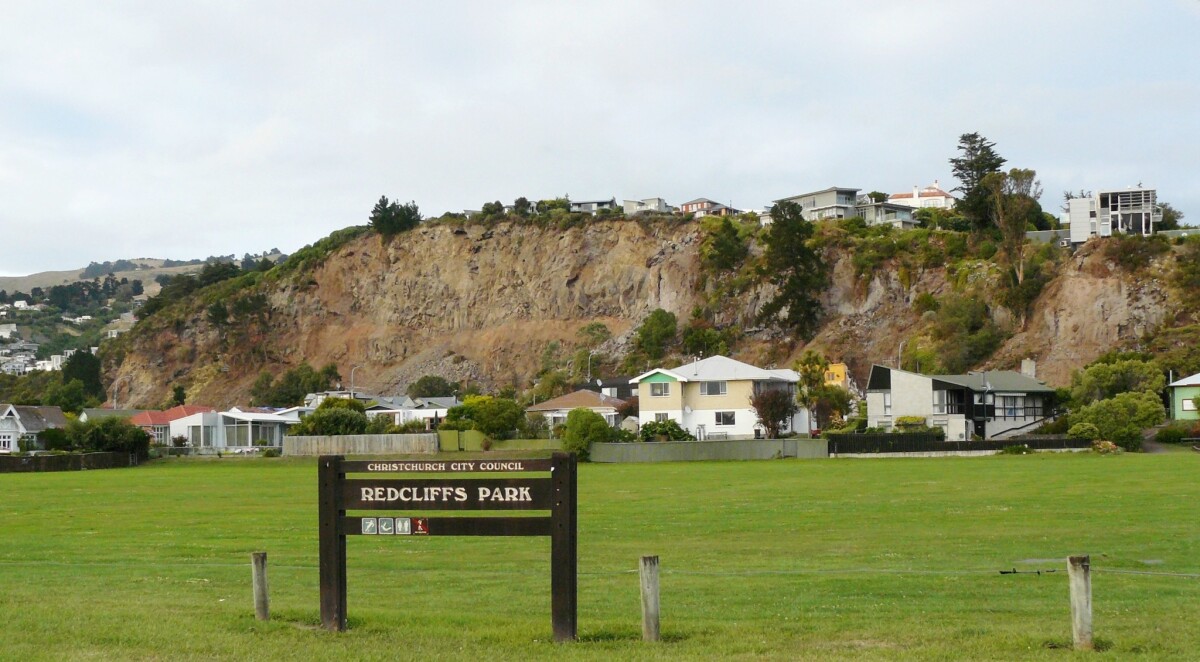 Redcliffs Park and houses in the foreground, with collapsed cliff behind.