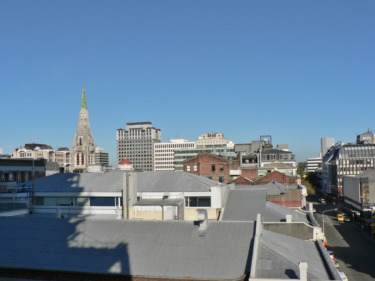 View along Gloucester Street and of rootops surrounding Cathedral Square.