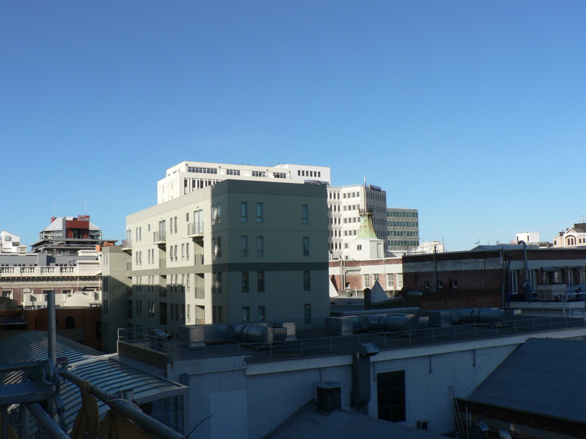 Rooftops of buildings in the north east corner of Cathedral Square seen from above Cathedral Junction.