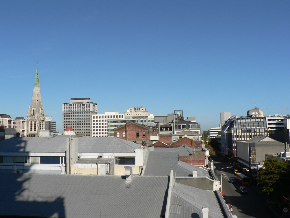 View of Gloucester Street, looking west, with north Cathedral Square and the intersection with Colombo Street.