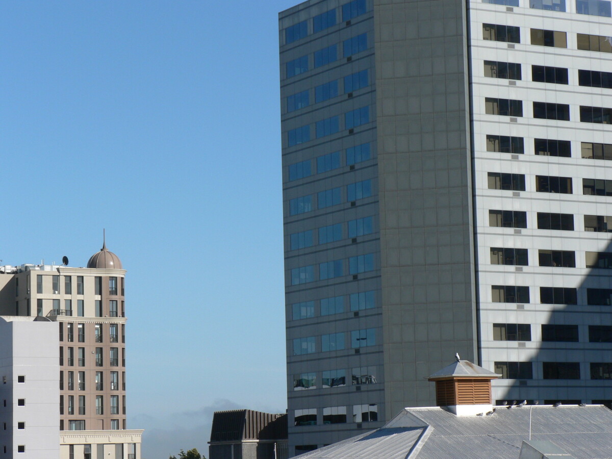 Closeup of Victoria Apartments and the Forsyth Barr building. Seen from Pacific Tower construction site.