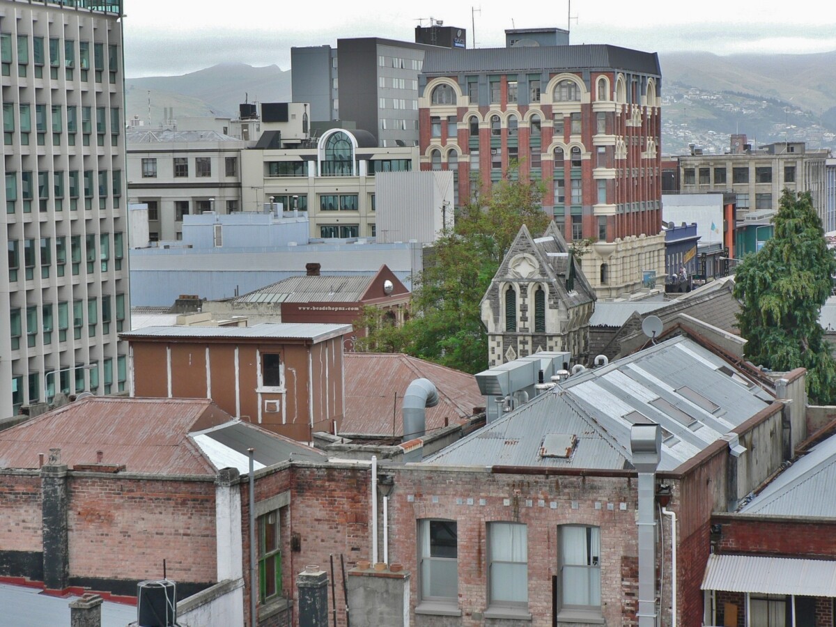 Close up of buildings on Manchester Street and Worcester Street. Seen from construction site of Pacific Tower on Gloucester Street.