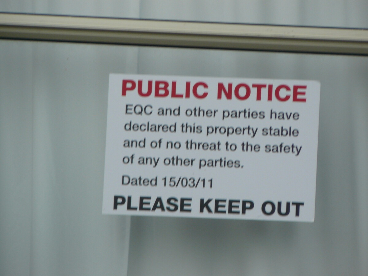 Closeup of a public notice sticker in the window of an earthquake damaged house.