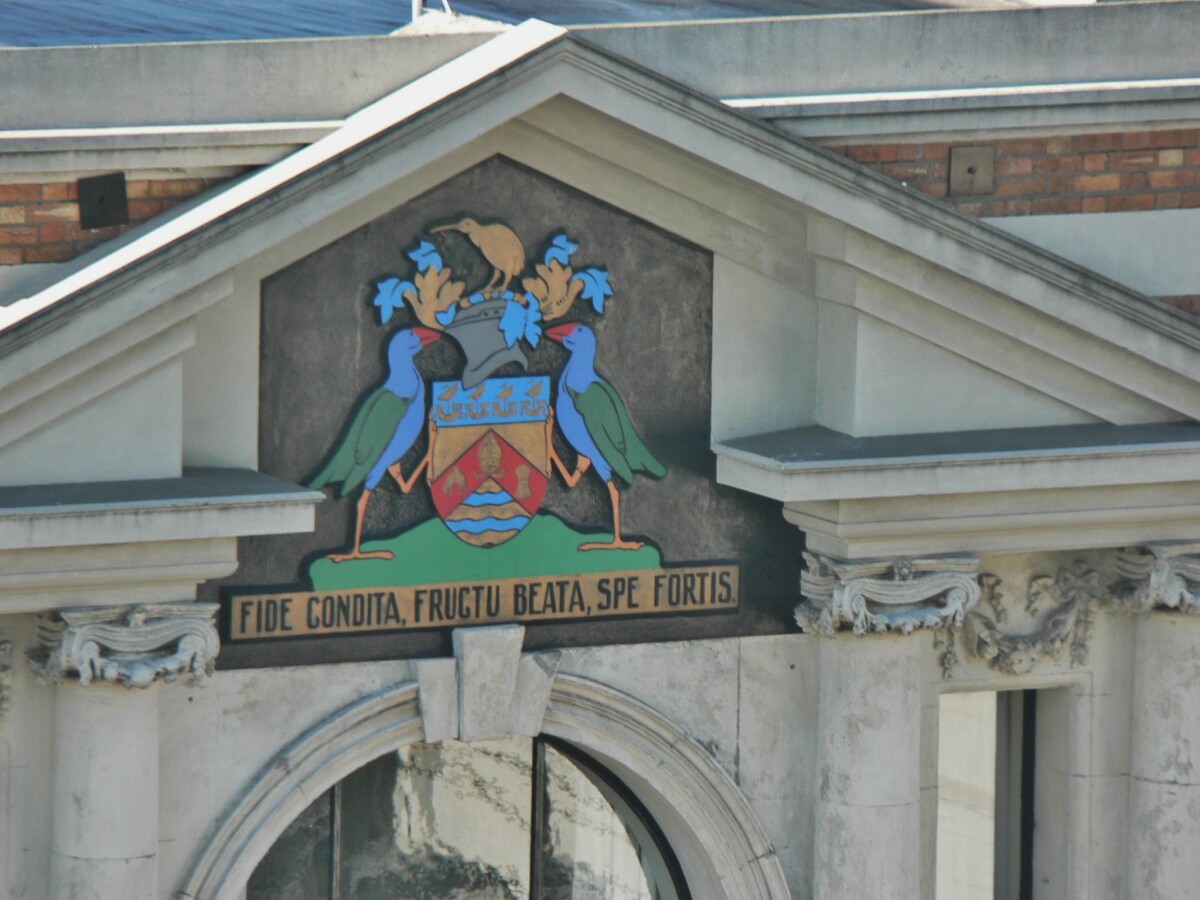 Christchurch city coat of arms on the Civic building, 194 Manchester Street.