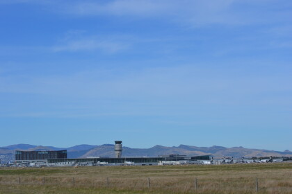 A helicopter on the tarmac at Christchurch International Airport during the opening ceremony of the new terminal building. Crowds of people are stood by the building watching the helicopter.