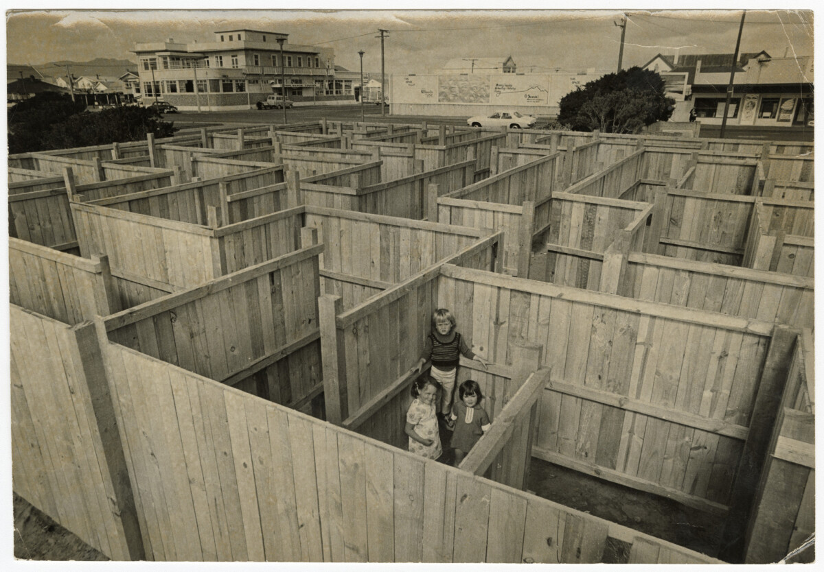 View from above of three children inside a maze at New Brighton on Seaview Road near the beach. Children are Michael Nixon and Rhonda Kennett (left) and Julie Ufton.
