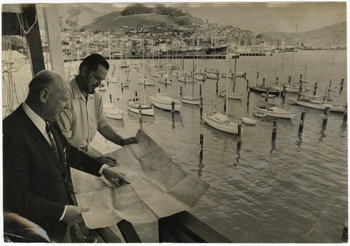 Mr B.R. Walker (left) chairman of the marine search and rescue committee planning an exercise over a chart of Lyttelton Harbour with Mr W. Baguley secretary of the Sumner Lifeboat Association.