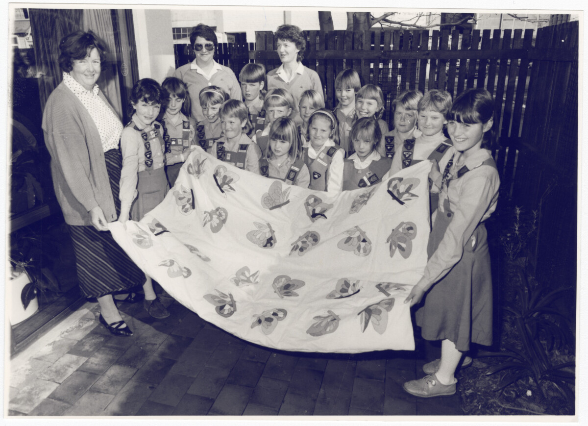 Members of the 29th Canterbury Brownie Pack presenting a handmade quilt to Mrs Caroline Cartwright (left) of the Cancer Society outside the Cancer Society Centre day room. At the rear are are Mrs Margaret Wright, the pack's Brown Owl, (left) and Mrs Jean Dalley, Cuckoo Owl.