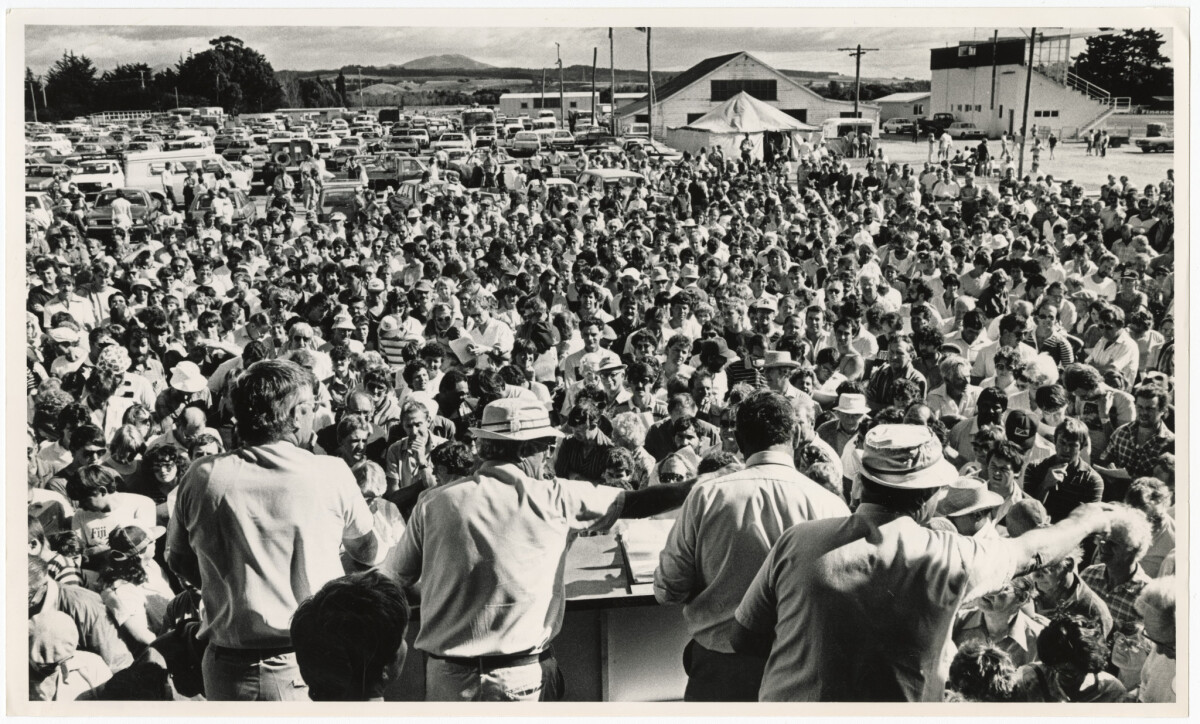 View of crowds, taken from the stage, of an auction at Rangiora showgrounds of items left over from the National Scout Jamboree.