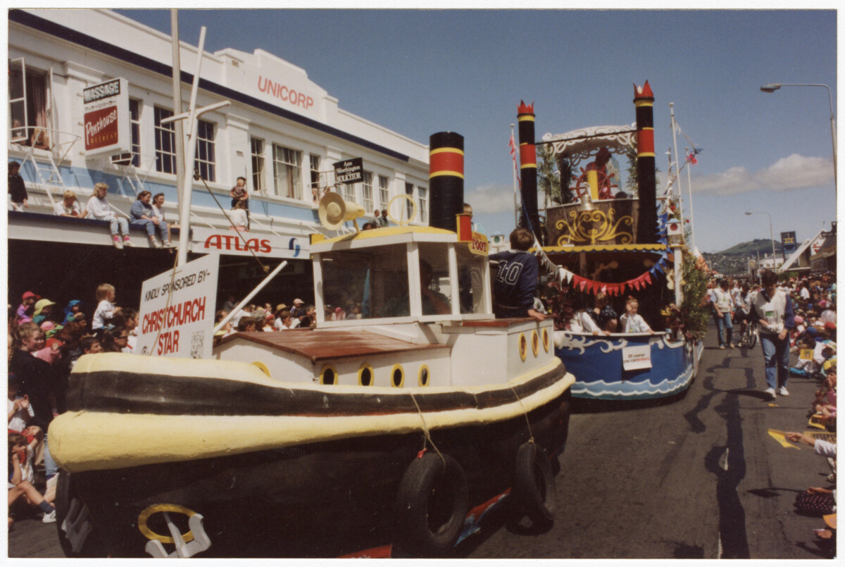 View down Colombo Street towards the Port Hills during the Santa Parade with a steam boat and paddle steamer floats passing the Unicorp building and crowds of spectators.