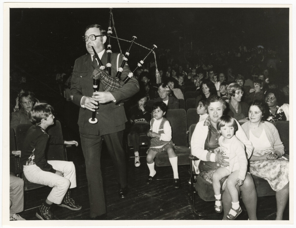 Policeman playing bagpipes at the Starlets Christmas Party at the Christchurch Town Hall. Families and children are sat in the audience.