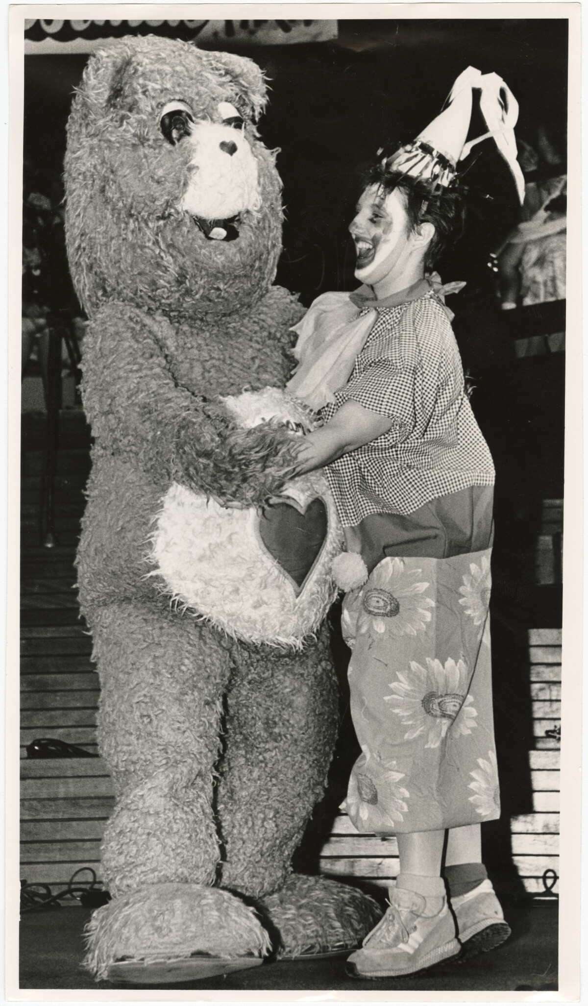 A person in a Care Bear, Tenderheart, costume dancing with a clown on stage at Christchurch Town Hall during a Starlets Christmas Party.
