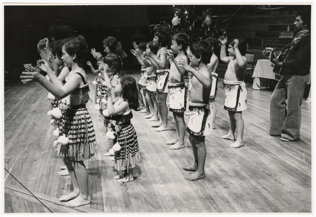 Te Kotahi Tangi Māori culture group performing on stage during the Starlets Christmas party at Christchurch Town Hall.
