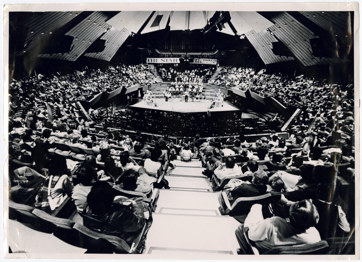 View from the back of the auditorium looking over the audience to the Christchurch Police Band on stage at the Christchurch Town Hall during the Starlets Christmas Party.