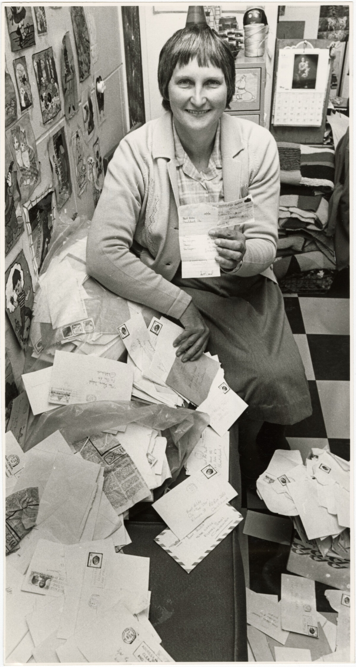Mrs Anne McDonnell with the stamps from the letters that the Starlets send in. She removes the stamps and then sells them so that the Star is able to sponsor three children overseas with the money raised.