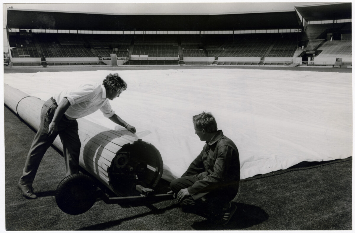 Warner Barber (left) and Russell Wylie, Lancastr Park Groundsman, putting a synthetic cover in place at Lancaster Park to protect the pitch from getting waterlogged during rain storms.