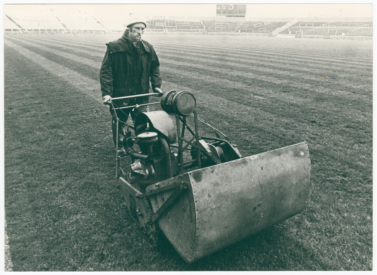 Groundsman Russell Wylie uses a roller at Lancaster Park to prepare the turf for an All-Blacks game.