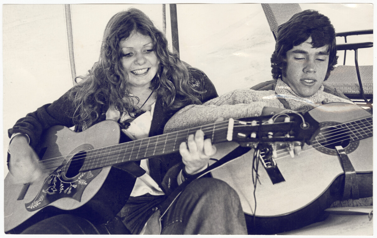 Wendy Harding and Bill van Peer, both students at Hillmorton High School, attempting to break the world record for non-stop guitar playing and to raise money for Save the Children.