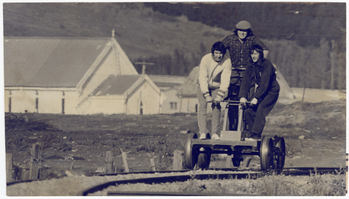 Robin Scanes (left) Martin Jansenns and Ashley Brown on a "Kalamazoo" trolley which they are travelling for 39 hours continuously up and down half a mile of railway track at Ferrymead. The site of the venture is between Bridle Path Road and Moorhouse Station near Truscotts Road.