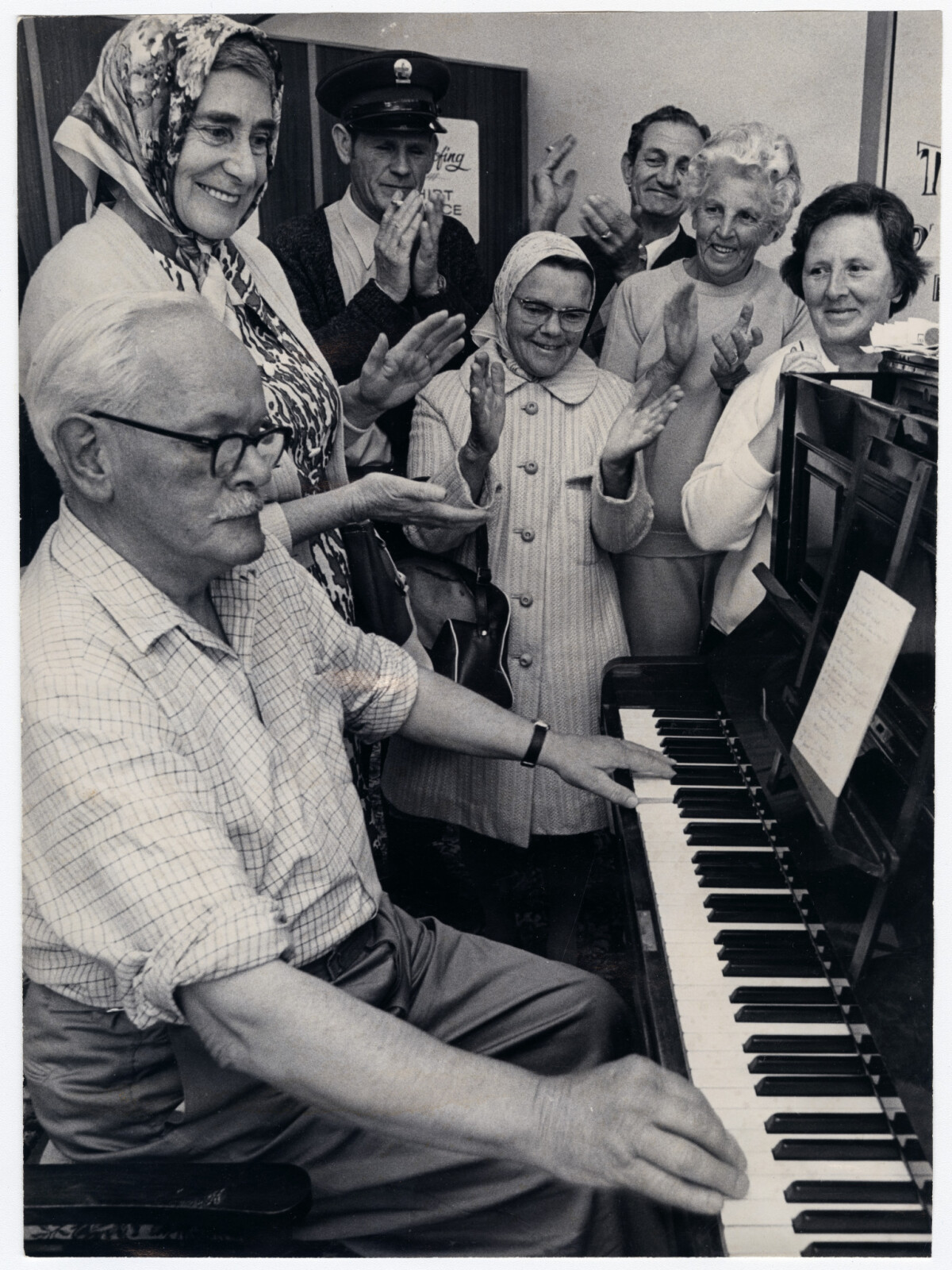 C.W. Hunter during his record breaking attempt to play the piano for 50 hours at Shirley shopping centre. Mr Hunter is playing his piano in the window of Taylors Dry Cleaners to raise money for the Society for the Prevention of Cruelty to Animals of which he is a former president.