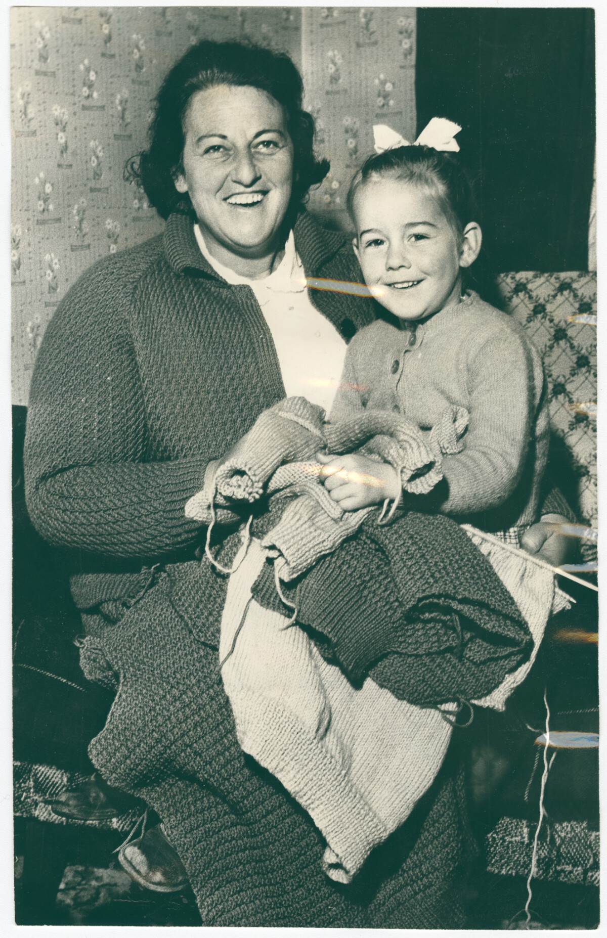 B.M. Hands, knitting champion, with daughter Stephanie at their home in Hornby.