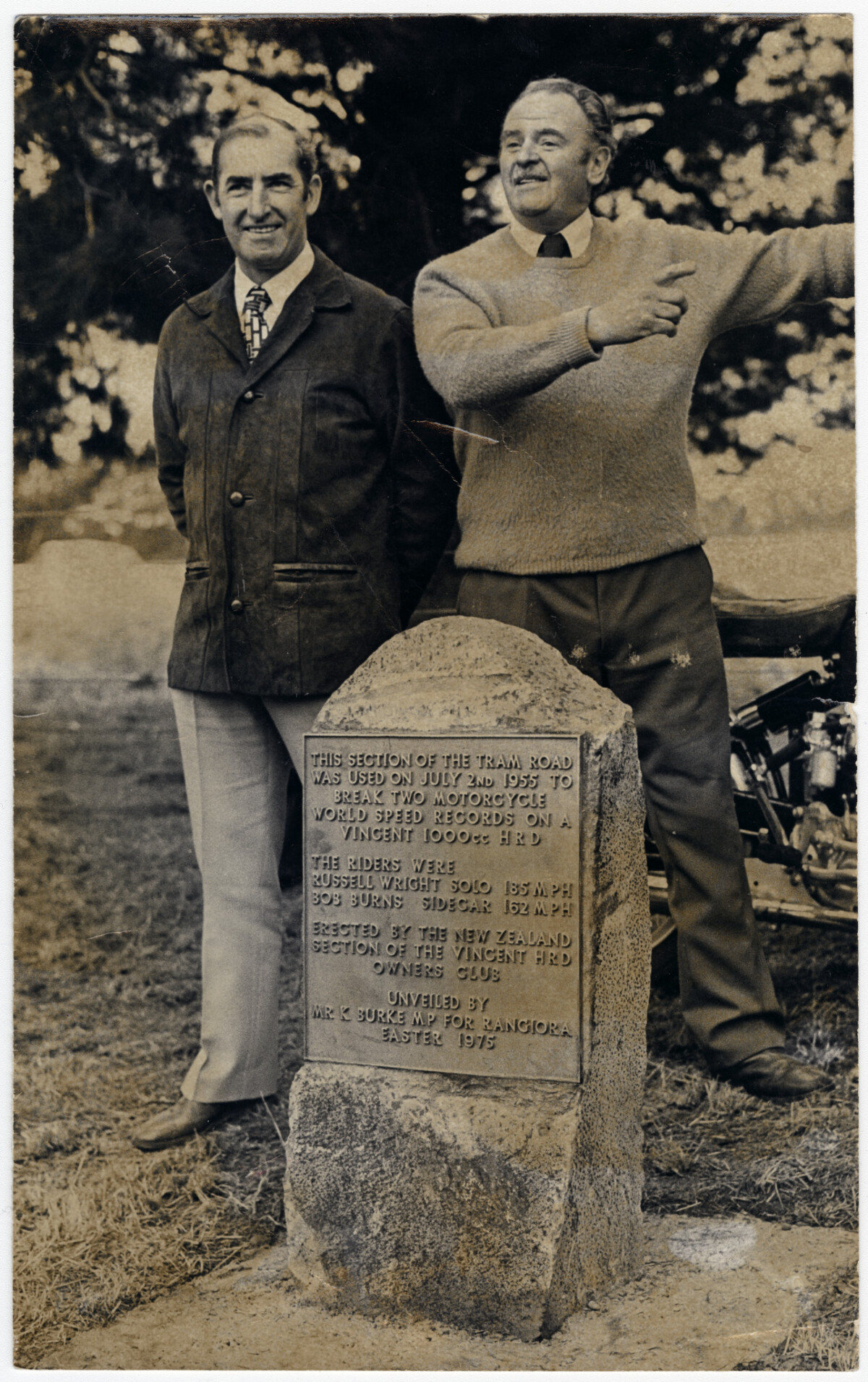 A plaque commemorating two motor cycle world records on the Tram Road near Swannanoa. The Vincent Owners Club financed the plaque to commemorate the records set on July 2, 1955, by Russell Wright (left) and Bob Burns. Burns set a world sidecar record of 162mph on the Tram Road with a Vincent Rapide. Wright raised the world solo record to 185mph.