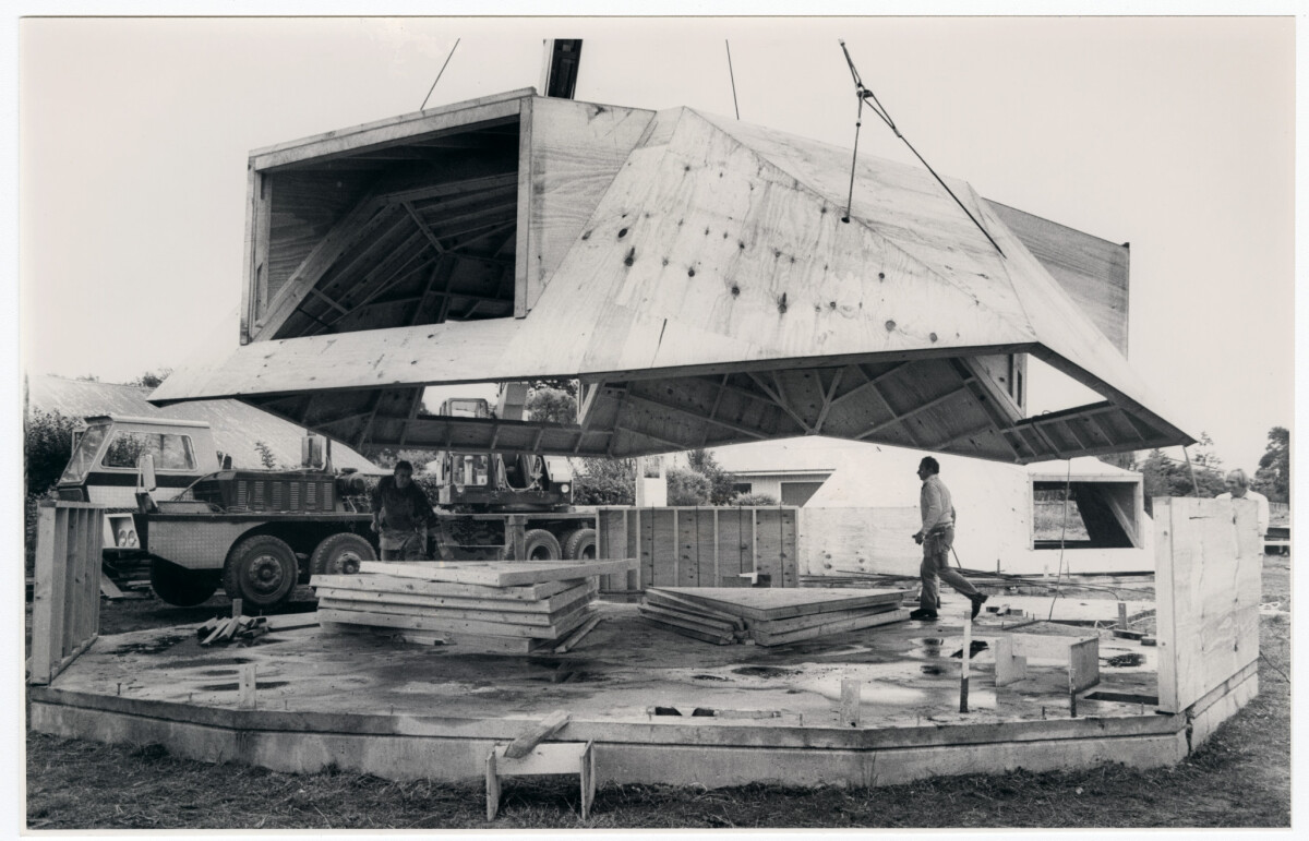 The exterior of a hexadome house being installed onto its foundations on their site at 280 Memorial Avenue in Burnside. Twenty four triangles and four six sided panels made up the dome frame and are the first of their type to be built in Christchurch.