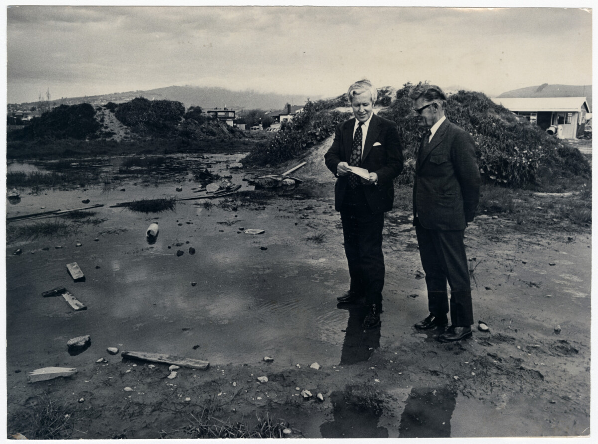 Citizens Association city councillors, H.G. Hay and M.R. Carter, inspecting land on Smith Street in Linwood in preparation for the potential sale of the land.