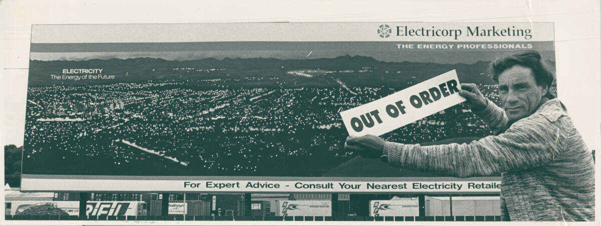 Bruce Humphries stood in front of a Electricorp advertisement on Lincoln Road with an 'out of order' sign.